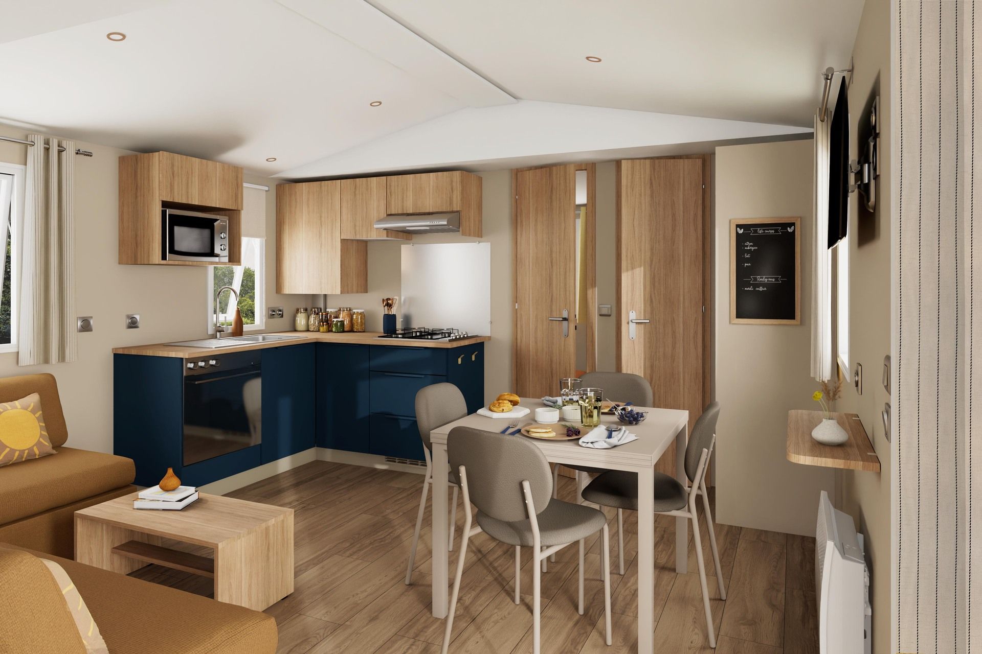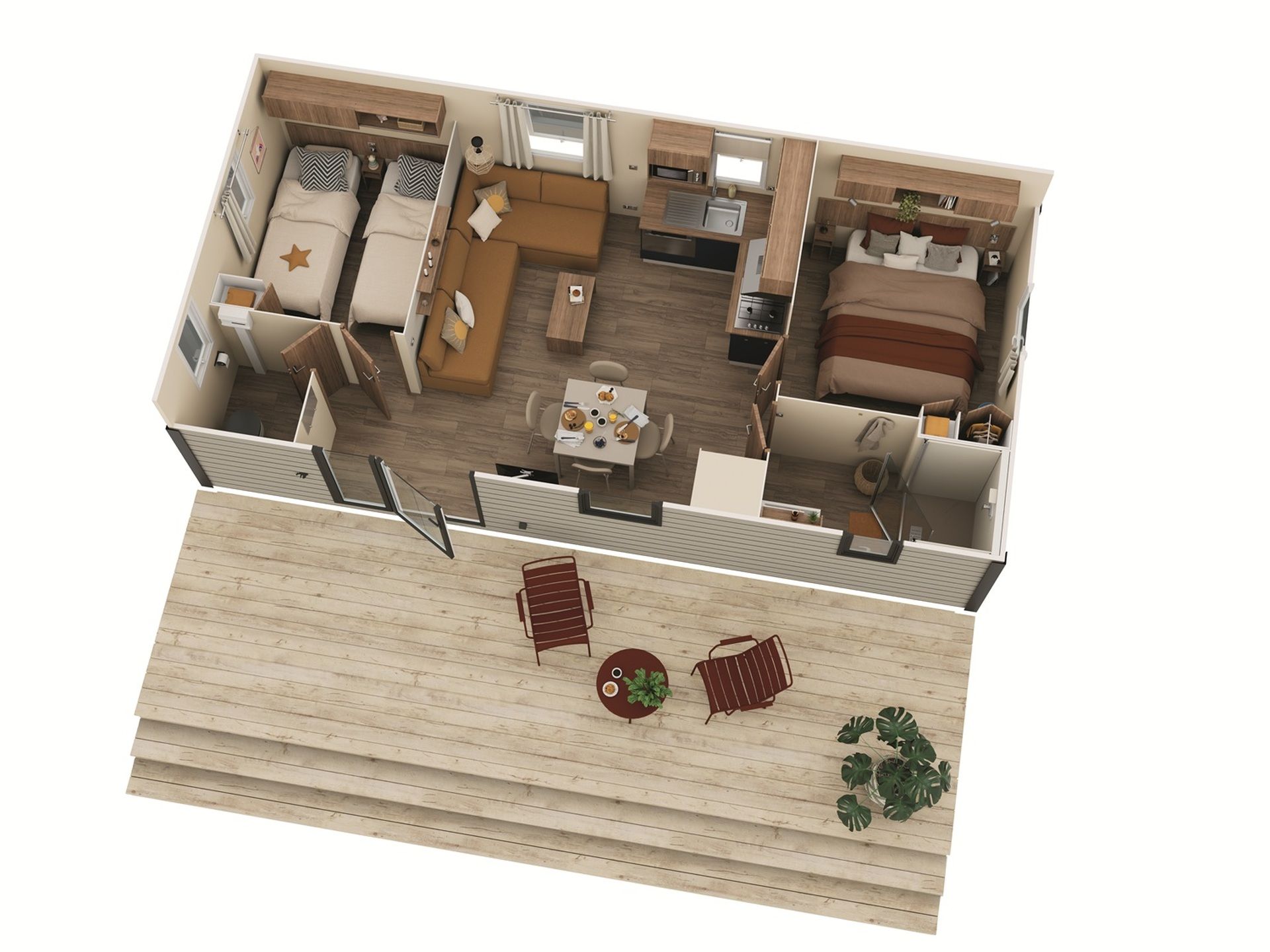 L'Aventura 2, un modèle Siblu spacieux à l’élégance naturelle, avec sa pièce de vie lumineuse et sa grande suite parentale. Parfait pour trouver la véritable paix intérieure, de jour comme de nuit.